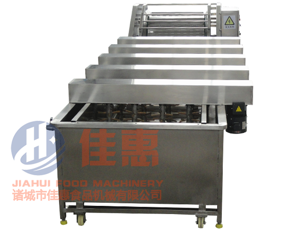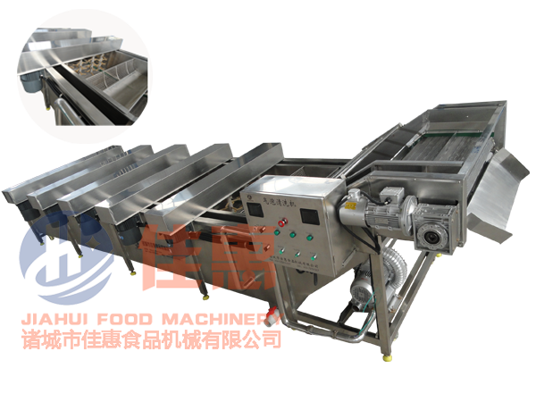 本設(shè)備為氣泡清洗機(jī)的改進(jìn)設(shè)備,槽體上方加裝了橡膠攪拌裝置,目的是針對不同的清洗物料達(dá)到不同的清洗效果,特別是對玉螺菜(別稱螺絲菜、寶塔菜)等根須比較發(fā)達(dá)的根莖類蔬菜清洗效果顯著。